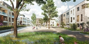 Dieser Neubaukomplex besteht aus 7 Baufeldern. Insgesamt entstehen hier ca. 800 Wohneinheiten, davon ca. 120 Einfamilienhäuser und ca. 680 Wohnungen in 20 Mehrfamilienhäusern und einem Großkomplex mit Wohnungen und Gewerbeflächen.